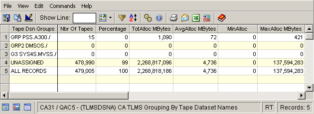 In this example a table view of the summary is displayed by selecting Select the By DSN Group object in the Summaries folder under the CATLMS folder in the Object Tree and clicking the cogs and clicking the cogs: