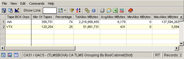 The Summary by Box/Cabinet (Slot) object displays a summary of all tapes grouped by Box/Slot/Cabinet ID. The CATLMS catalog controls all of the tapes in the summary. The CATLMS Tape Volume records provide input to this summary.