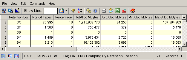 In this example a table view of the summary is displayed by selecting the By Retention Location object in the Summaries folder under the CATLMS folder in the Object Tree and clicking the cogs: