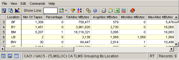 In this example a table view of the summary is displayed by selecting the By Location object in the Summaries folder under the CATLMS folder in the Object Tree and clicking the cogs: