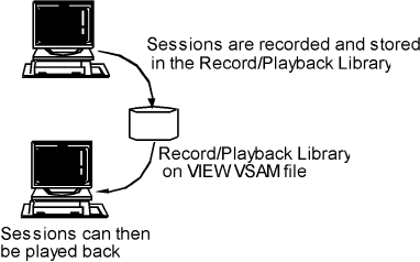The Record/Playback feature allows you to record application sessions and play them back at a later time. It is an advanced feature of the View facility. The recorded sessions are stored in the Record/Playback library. The library is saved on the VIEW file, one of the VSAM files.