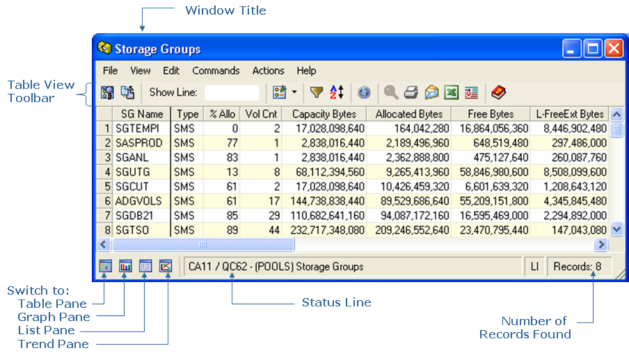 The default view for the Windows Client is Table View. The Table View displays objects in configurable tables. You can change display characteristics (such as the width and number of table columns, the number of rows displayed, and so on) and characteristics that apply to specific objects, such as sort and filter criteria. The display and object-specific characteristics determine the appearance of the table. When you save your user‑defined views, you automatically save the display and object characteristics with it.