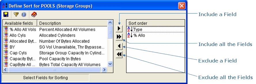 The Sort feature sorts the table by the values in the columns of the table. Every object attribute (or field for z/OS) in a table can serve as a sort key, as shown in the following sample: