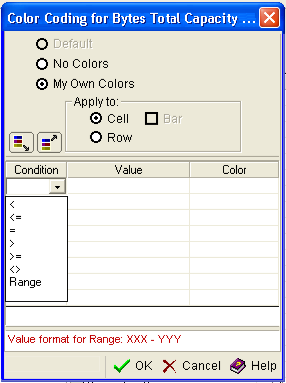 You can set conditions for color coding values in object views. The following sample shows you can select a Condition, enter a condition Value, and then select a Color which will show as the background color in the object view for the item that meets the condition:
