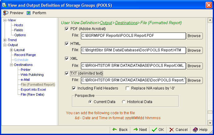 Each Output Destination gives you additional options; for example, the File (Formatted Report) destination dialog gives you the choice of file formats and a Browse button that allows you to select the output directory, as shown in the following sample: