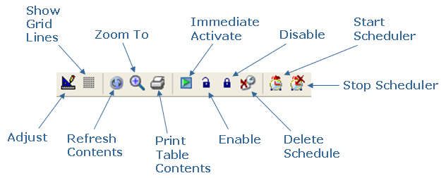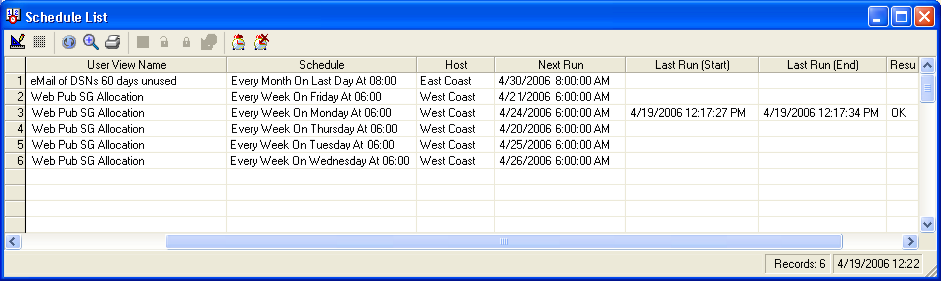 The Windows Client also includes a Schedule List. This is a list of all your scheduled activities. You can use the Schedule List option to start the scheduler and manage scheduled items. The following is an example of the Schedule List dialog: