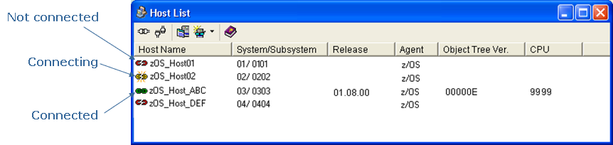 The Windows Client stores the host definition. The definition will be displayed in the Host List dialog. The Host List dialog displays defined hosts and their connection status, as shown in the following sample: