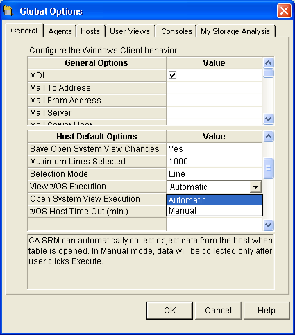 The Windows Client will collect data based on the mode that you have chosen. If you select Automatic then the Windows Client will automatically collect object data from the host when an object view is opened. If you select Manual then the Windows Client will only collect object data from the host after you click the Execute icon in the tool bar of the object view.