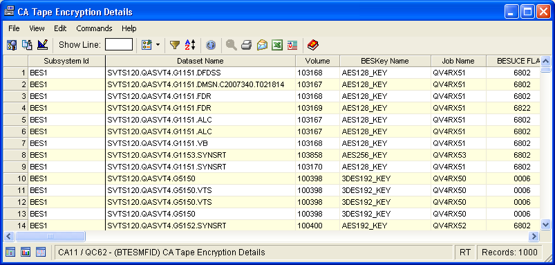 The Tape Encryption/Decryption Details window displays detailed information about the most recent 1000 encrypted or decrypted files for each active subsystem. The number of records is limited by a restriction in the BES database that only allows 1000 records per BES task to be stored.