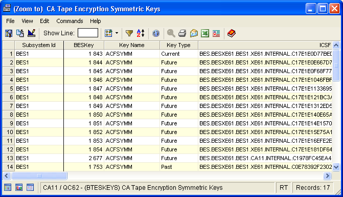 The (Zoom to) Tape Encryption Symmetric Keys window opens displaying all generations of the selected key. For example, if you have requested that 7 generations of a key be always kept in advance, the window displays at least 8 key instances. The first key in the table is the Current key, followed by Future and Past keys. The following is a sample of the (Zoom to) Tape Encryption Symmetric Keys window:
