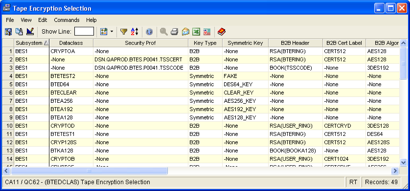 The Encryption Selection object can help you troubleshoot data set set selection problems. For instance, if you set up a data class but misspell a key name, so that the name does not match any of the keys in the CA Tape Encryption parmlib, you can use this display to check the key name spelling. Similarly, you can use this display to verify the external security system definitions for selection, verifying the dataset name and the CA Tape Encryption keywords associated with the security profile.