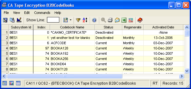 The Tape Encryption B2BCodeBooks dialog displays all the B2B code books you have defined in the B2BBOOKS parmlib member, and which have been loaded into the CA Tape Encryption database. B2B code books are used to encrypt tapes for use on distributed systems.