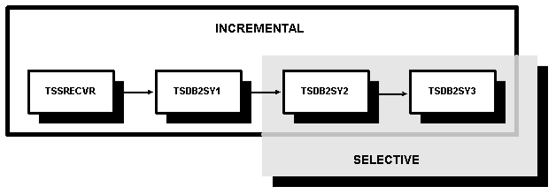 The number of components you use, or jobs you run, depends on the type of synchronization you wish to perform. Synchronizing only changes made during the day (incremental) for a DB2 subsystem, you must use all four components: TSSRECVR, TSDB2SY1, TSDB2SY2, TSDB2SY3. Selectively synchronizing (specific resources or users) security information for a DB2 subsystem requires two of the components: TSDB2SY2 and TSDB2SY3. The utility cross‑references user and authorization information for selected users and resources in the CA Top Secret Security File with DB2 resources in the DB2 catalog. Using this information, the utility synchronizes the DB2 subsystem's catalog with CA Top Secret Option for DB2 security information.
