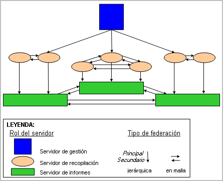 Cuando cree un mapa de federación, tenga en cuenta los distintos tipos de informes para los que desea diversos conjuntos de datos consolidados. Por ejemplo, piense en un escenario donde desea que los datos consolidados utilicen tres tipos de agrupaciones de servidores: