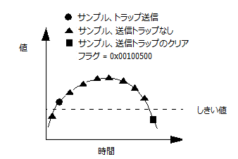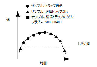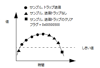 以下の図は、エージェントがこの monitor ディレクティブに基づいてトラップをどのように送信しクリアするかを示します。