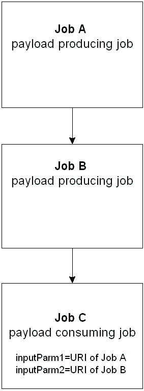 The following diagram shows the relationship between three jobs in a job flow. Job A and Job B are payload producing jobs that produce binary output. Job C is a payload consuming job that takes two parameters, inputParm1 and inputParm2. Job C uses the output from Job A and Job B as input values. In the definition of Job C, the value of inputParm1 is specified as the URI of Job A and the value of inputParm2 is specified as the URI of Job B.