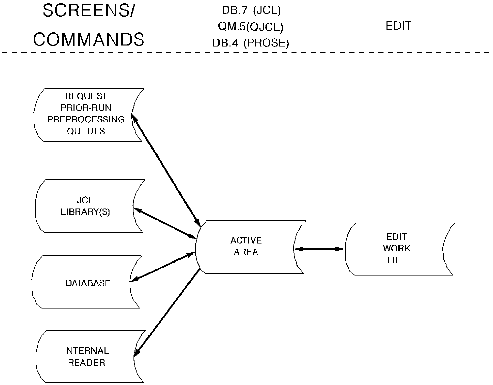 This facility consists of files, panels, programs, and a command. The command is EDIT that can be issued as a top line command or as a panel function. The files are referred to as active area and the edit work file (EWF). The panels and programs vary based on the environment from which EDIT is issued.