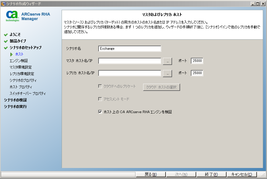シナリオ作成ウィザードの初期実行時に、[マスタ ホスト名/IP]および[レプリカ ホスト名/IP]ボックスに、サーバ名の代わりに <Arcserve>-IP およびレプリカ IP アドレスを入力します。