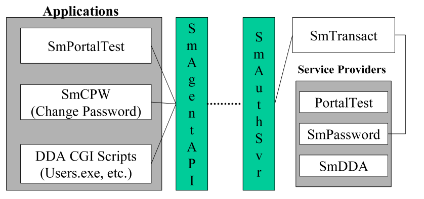 Client applications, often running on a Web Server, make calls to the SmPortal library. SmPortal determines the location of the service provider and how to get there (using SmPortal.cfg). The call is made to SiteMinder communications code and data is passed to the SiteMinder Policy Server.