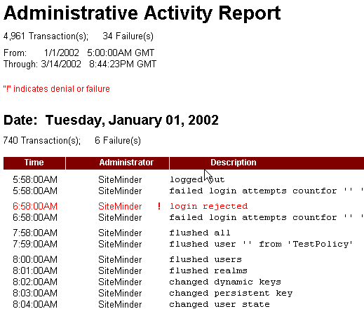 The number of transactions and failures, and the dates covered in the report appear under the title of the Administrative Activity Report. Since this type of report contains all logged administrative events, the categories are: