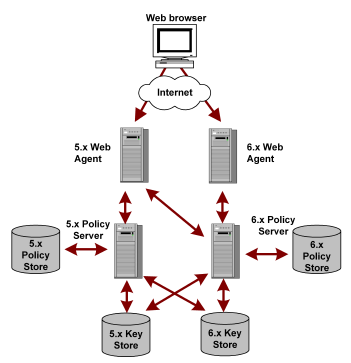 If your environment has a mix of 5.x and 6.x components, 6.x Policy Servers can use 5.x or 6.x policy stores, as illustrated in the following figure. Regardless of whether you have a mix of Policy Server versions, users can access resources and have the same experience using 5.x or 6.x Agents. Also, a mixed environment supports single sign–on.