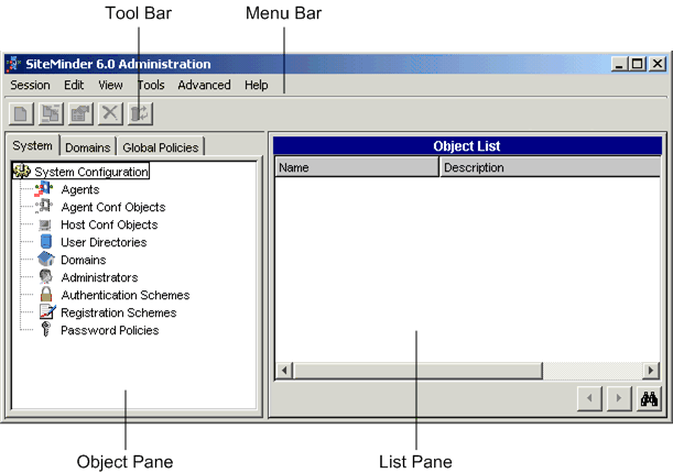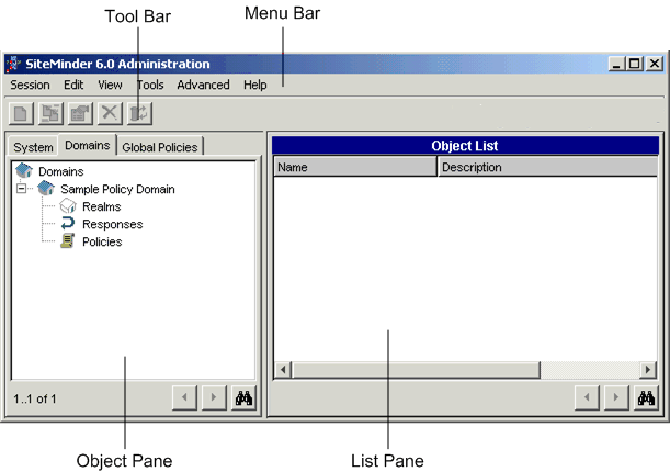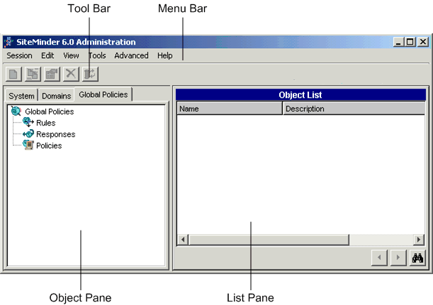 The object pane can contain three tabs: System, Domain, and Global Policies. These tabs allow you to access a hierarchy of SiteMinder objects.