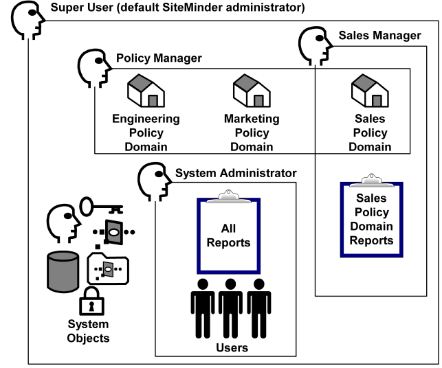 In the previous figure, certain administrative responsibilities overlap. For example, the Policy Manager and the Sales Manager may both make changes to the Sales policy domain and the objects (rules, policies, responses, etc.) contained in the policy domain. The Super User may access all objects, manage users, and view all reports. You can create administrators and assign privileges to the administrators to match the administrative roles that exist in your organization.