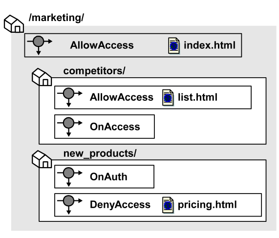 In the diagram above, different realms and nested realms have specific rules associated with the resources in the realm. It is also possible to have a single rule associated with all of the resources in a realm, or a subset of resources in the realm. This is done by using resource matching or regular expressions to specify resources.