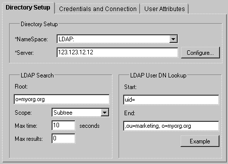 To locate a user across many organizational units, define the Start property as (&(objectclass=inetOrgPerson)(uid= and define the End property as )). Only the unique part, the uid value, must be specified in the credentials. In the section of the User Directory Dialog shown above, these values replace the values contained in the LDAP User DN Lookup group box.