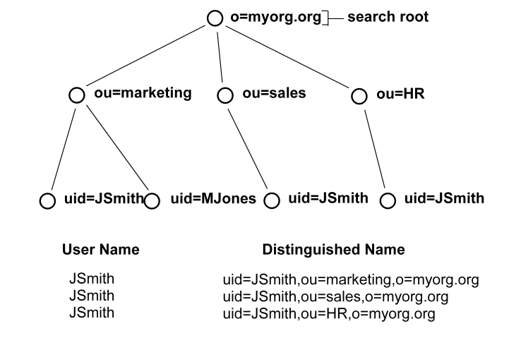 In the previous diagram, the LDAP DIT design requires a DN to be of the form uid=JSmith,ou=marketing,o=myorg.org.