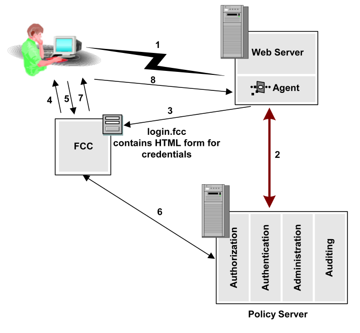 - The Web Agent contacts the Policy Server and determines that the user’s request must be redirected to the credential collector.