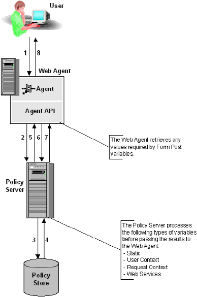 - If the policy contained Form Post variables, the Policy Server processes the policy with the newly resolved values extracted from the POST data.