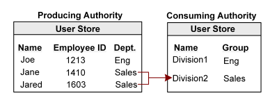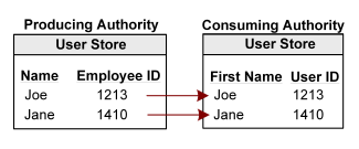 One-to-one mapping is often referred to as account linking, as it links an account at a producing authority site to an account at a consuming authority, as shown in the following illustration: