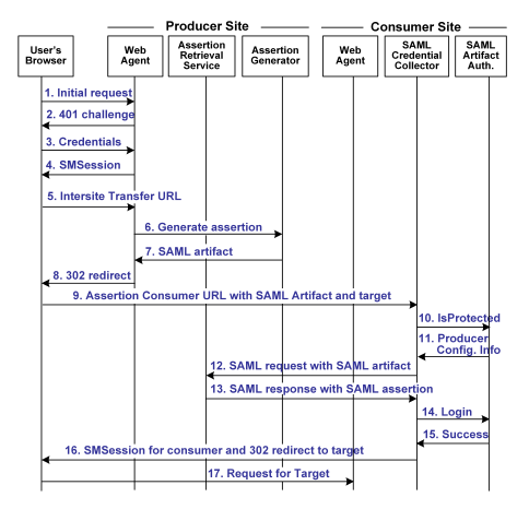 The illustration that follows shows the detailed flow between a user's browser and the Federation Security Service components deployed at the producer and consumer sites. This set-up enables single sign-on between the sites. SAML artifact profile is the authentication method and the flow diagram assumes successful authentication and authorization at the producer and consumer sites.