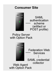 The SAML 1.x authentication scheme is configured at the consumer-side Policy Server and is invoked by the SAML credential collector. The SAML credential collector is a component of the Federation Web Services application and is installed on the consumer-side Web Agent or SPS federation gateway. The credential collector obtains information from the SAML authentication scheme at the Policy Server, then uses that information to access a SAML assertion.