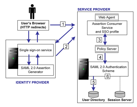The following illustration shows how the SAML 2.0 authentication scheme processes requests.