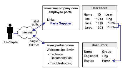 When a buyer for smcompany.com authenticates at smcompany.com and clicks a link to access information at partsco.com, she is taken directly to the ordering area of partsco.com's web site without having to sign on.