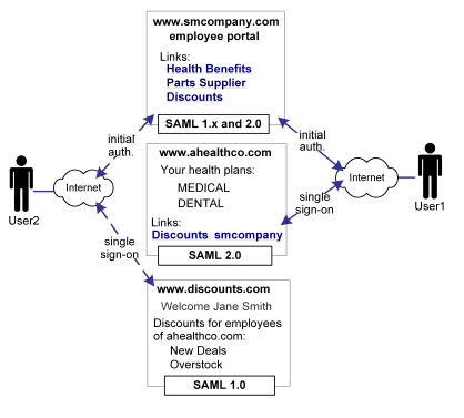 In Use Case 8, smcompany.com issues assertions for ahealthco.com and discounts.com. Ahealthco.com uses SAML 2.0 for User1 to communicate between smcompany.com and ahealthco.com. Discounts.com uses SAML 1.0 for User2 to communicate between smcompany.com and discounts.com. The assertions must be suitable for the particular protocol used by the SP consuming the assertion.