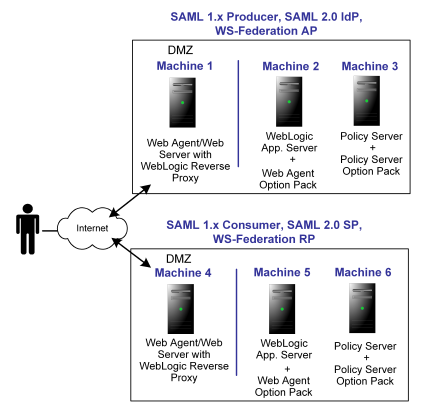 The following illustration shows a SiteMinder and WebLogic sample configuration. It provides an example of how to use FWS in a sample federated environment.