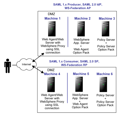 On Machines 2 and 5, deploy FWS. These machines must also have WAS and the associated WAS Fix Pack, if applicable. On Machines 1 and 4, install the Web Agent and the WAS Proxy Plug-in. Enable SSL between the Proxy and the WAS.