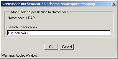 Opens the Authentication Scheme Namespace Mapping dialog where you can enter a Search Specification which defines the attribute that the authentication scheme uses to search a namespace. Use %s in the entry as a variable representing the assertion data collected by the Search Data XPATH query.