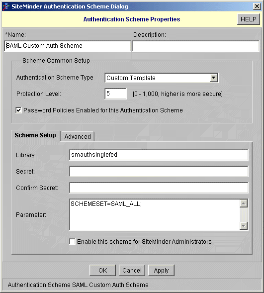 - Disregard the Enable this scheme for SiteMinder Administrators checkbox.