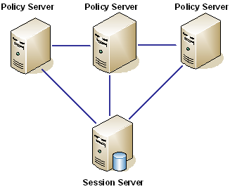 The following figure shows a Policy Server cluster communicating with one session server: