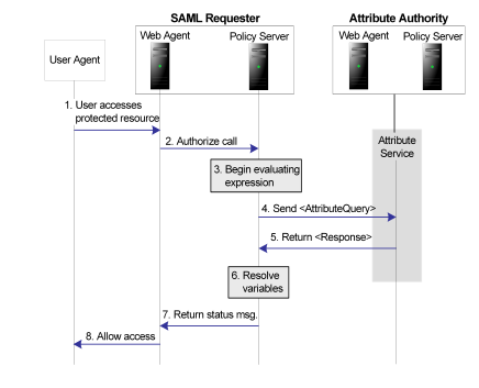 - The Web Agent at the SAML Requester makes a call to the local Policy Server determine if the user is authorized to access the resource. The policy that protects the resource uses a policy expression for authorization with a federated attribute variable.
