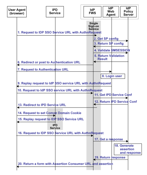 - The user agent requests the IdP SSO Service URL. This request is equivalent to the request from step 8, but now the user has a valid SMSESSION cookie.