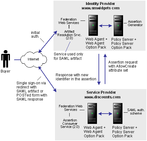 - The user clicks on a link at discounts.com to take him to the target site. This link initiates a call to the local Policy Server to generate an authentication request. In this request, an optional attribute called AllowCreate has been included, based on the configuration of the SAML 2.0 authentication scheme at the Service Provider.
