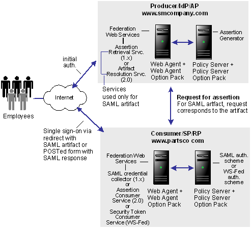 The following illustration is similar for SAML 1.x, SAML 2.0, and WS-Federation; however, the Federation Web Services components are different as follows: