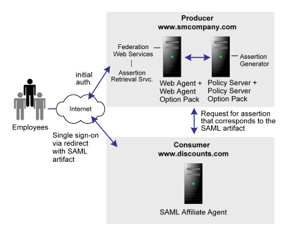 Smcompany.com is acting as a SAML 1.x producer. When an employee of smcompany.com accesses an employee portal at www.smcompany.com, the following occurs: