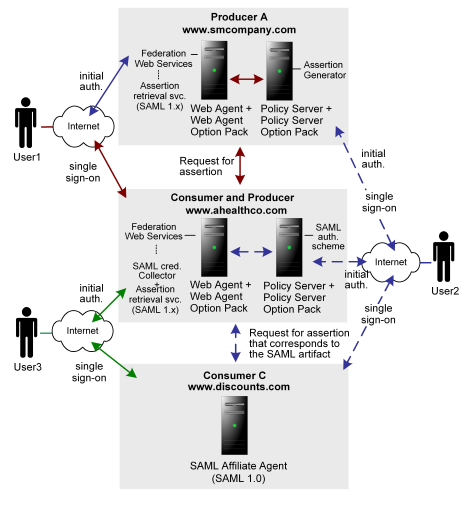 - The administrator has configured an affiliate object that represents discounts.com so an assertion is produced for User2 and User3. This makes single sign-on to discounts.com possible.