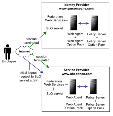 - Single logout is enabled using the Policy Server User Interface at the Identity Provider and the Service Provider.